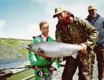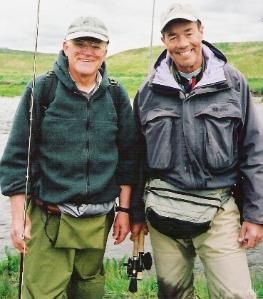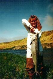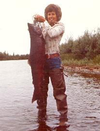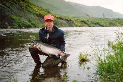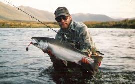 Dennis Anderson, journalist for the Minneapolis Star Tribune with a fly caught King Salmon.